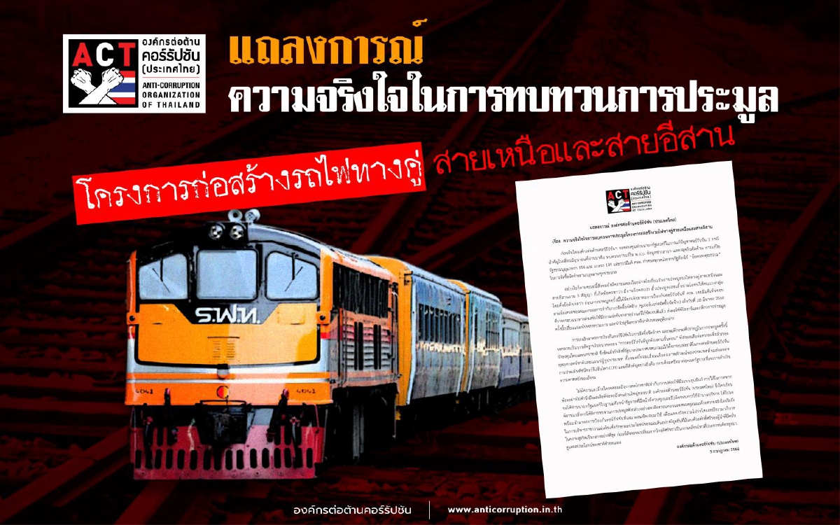 เมื่อวันที่ 5 กรกฎาคม องค์การต่อต้านคอร์รัปชัน (ประเทศไทย) หรือ ACT ออกแถลงการณ์ เรื่อง  ความจริงใจในการทบทวนการประมูลโครงการก่อสร้างรถไฟทางคู่สายเหนือและสายอีสาน  โดยเนื้อหาในแถลงกาณ์ระบุ ดังนี้  ก่อนอื่นใดองค์กรต่อต้านคอร์รัปชันฯ ขอขอบคุณท่านนายกรัฐมนตรีในการแก้ปัญหาคอร์รัปชัน 3 กรณีสำคัญในเดือนมิถุนายนที่ผ่านมา คือ ทบทวนการแก้ไข พ.ร.บ.ข้อมูลข่าวสารฯ แสดงจุดยืนคัดค้าน การแก้ไขรัฐธรรมนูญมาตรา 144 และ มาตรา 185 และการมีมติ ครม. กำหนดทุกหน่วยงานรัฐต้องใช้ “ข้อตกลงคุณธรรม” ในการจัดซื้อจัดจ้างตามกฎหมายทุกประเภท