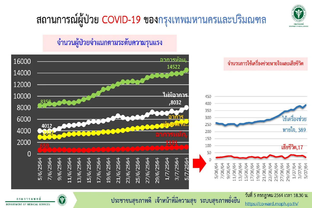 เมื่อวันที่ 6 ก.ค. 64 นพ.ทวีศิลป์ วิษณุโยธิน โฆษกศูนย์บริหารสถานการณ์โควิด-19 ศบค. กล่าวระหว่างแถลงสถานการณ์ระบาดโรคติดเชื้อโควิด-19 ประจำวันว่า จำนวนผู้ติดเชื้อรายใหม่วันนี้ ยังคงเพิ่มขึ้นสูงสุดอยู่ในกรุงเทพฯ ที่ 1,492 ราย ขณะที่ปริมณฑลรวม 5 จังหวัด อยู่ที่ 1,372 ราย, 4 จังหวัดชายแดนภาคใต้ 635 ราย และ 67 จังหวัดที่เหลือ รวม 1,876 ราย ซึ่งการระบาดของไวรัสโควิดในกรุงเทพฯ ยังเป็นจาก 2 สายพันธุ์หลัก คือ สายพันธุ์อัลฟา (อังกฤษ) และสายพันธุ์เดลตา (อินเดีย)