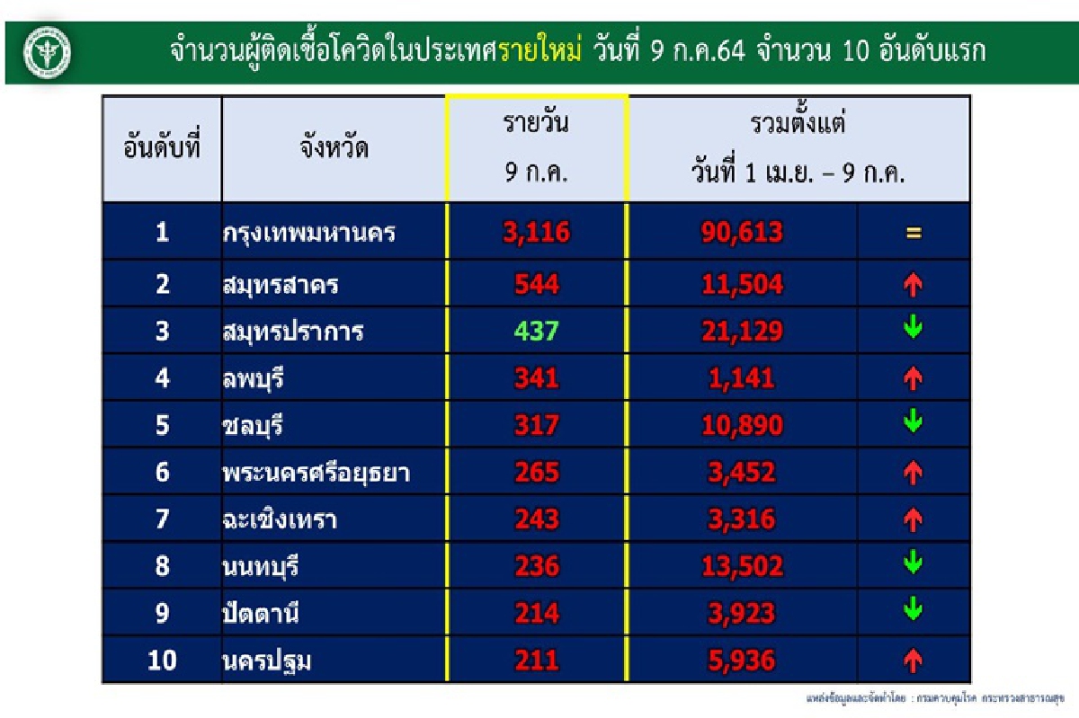 -จํานวนผู้ติดเชื้อโควิดในประเทศรายใหม่ วันนี้ 10 จังหวัดอันดับแรก 1.กรุงเทพมหานคร 3,116 ราย 2.สมุทรสาคร 544 ราย 3.สมุทรปราการ 437 ราย 4.ลพบุรี 341 ราย 5. ชลบุรี 317 ราย 6.พระนครศรีอยุธยา 265 ราย 7.ฉะเชิงเทรา 243 ราย 8.นนทบุรี 236 ราย 9.ปัตตานี 214 ราย และ 10.นครปฐม 211 ราย