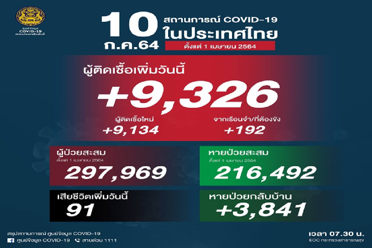 ศบค.เผยไทยติดเชื้อโควิดเพิ่ม 9,326 ราย มีผู้เสียชีวิตอีก 91 ราย ขณะที่ผู้ป่วยรักษาหายเพิ่ม 3,841ราย