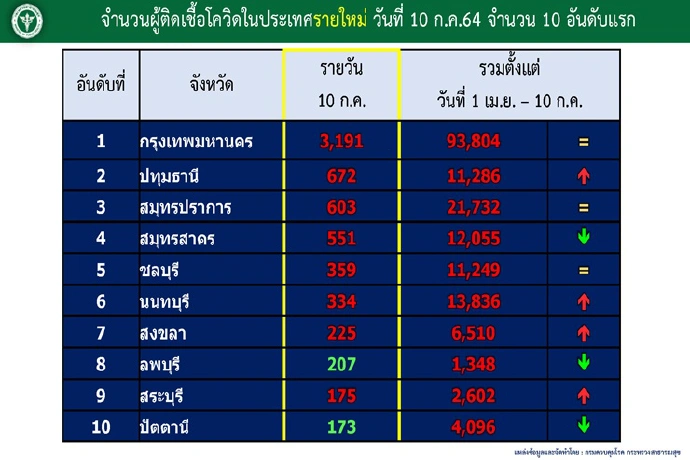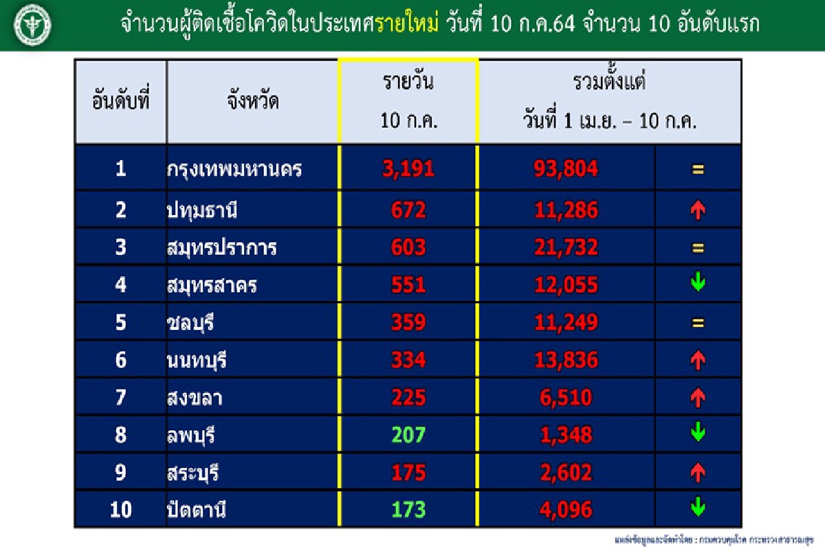 -จํานวนผู้ติดเชื้อโควิดในประเทศรายใหม่ วันนี้ 10 จังหวัดอันดับแรก 1.กรุงเทพมหานคร 3,191 ราย 2.ปทุมธานี 672 ราย 3.สมุทรปราการ 603 ราย 4.สมุทรสาคร 551 ราย 5. ชลบุรี 359 ราย 6.นนทบุรี 334 ราย 7.สงขลา 225 ราย 8.ลพบุรี207 ราย 9.สระบุรี 175 ราย และ 10.ปัตตานี 173 ราย