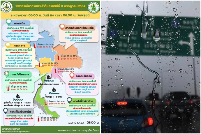 เมื่อวันที่ 11 ก.ค. 64 กรมอุตุนิยมวิทยารายงาน ลักษณะอากาศทั่วไปว่า พยากรณ์อากาศ 24 ชั่วโมงข้างหน้า ร่องมรสุมพาดผ่านภาคกลางตอนล่างและภาคตะวันออก ประกอบกับมรสุมตะวันตกเฉียงใต้กำลังแรงพัดปกคลุมทะเลอันดามัน ภาคใต้ และอ่าวไทย ทำให้ประเทศไทยมีฝนตกต่อเนื่อง โดยมีฝนตกหนักมากบางแห่งบริเวณภาคตะวันออกและภาคใต้ตะวันตก ขอให้ประชาชนในพื้นที่เสี่ยงภัยบริเวณดังกล่าวระวังอันตรายจากฝนตกหนักและฝนตกสะสม ซึ่งอาจทำให้เกิดน้ำท่วมฉับพลันและน้ำป่าไหลหลากได้