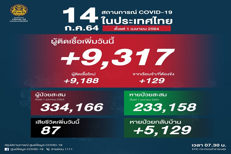 ศบค.เผยไทยติดเชื้อโควิดเพิ่ม 9,317 ราย มีผู้เสียชีวิตอีก 87 ราย ขณะที่ผู้ป่วยรักษาหายเพิ่ม 5,129 ราย