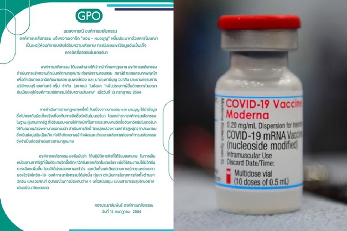 องค์การเภสัชกรรม ออกแถลงการณ์ แจ้งความดำเนินคดี "ลอย ชุนพงษ์ทอง - นพ.บุญ วนาสิน"หมิ่นประมาทด้วยการโฆษณา อันเป็นเหตุให้ อภ. ได้รับความเสียหาย กรณีเผยแพร่ข้อมูลเท็จการจัดซื้อวัคซีนโมเดอร์นา