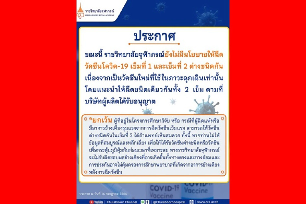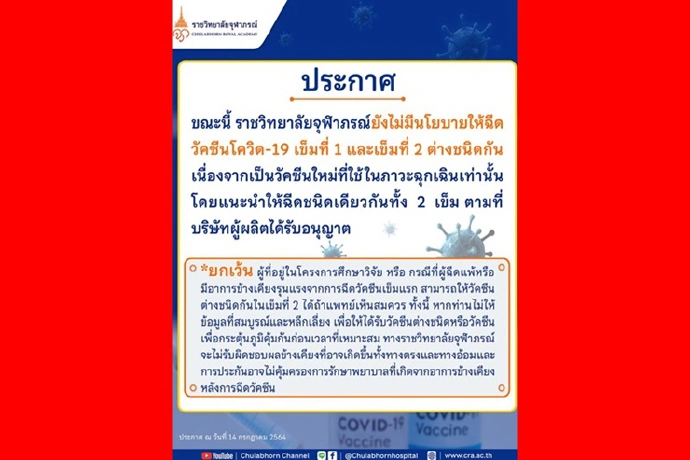 เมื่อวันที่ 14 ก.ค. 64 เฟซบุ๊ก โรงพยาบาลจุฬาภรณ์ ราชวิทยาลัยจุฬาภรณ์ ออกประกาศ ระบุว่า ขณะนี้ราชวิทยาลัยจุฬาภรณ์ ยังไม่มีนโยบายให้ฉีดวัคซีนโควิด-19 เข็มที่ 1 และเข็มที่ 2 ต่างชนิดกัน เนื่องจากเป็นวัคซีนใหม่ที่ใช้ในภาวะฉุกเฉินเท่านั้น โดยแนะนำให้ฉีดวัคซีนชนิดเดียวกันทั้ง 2 เข็ม ตามที่บริษัทผู้ผลิตได้รับอนุญาต