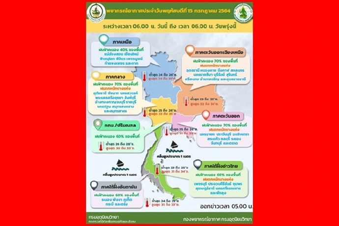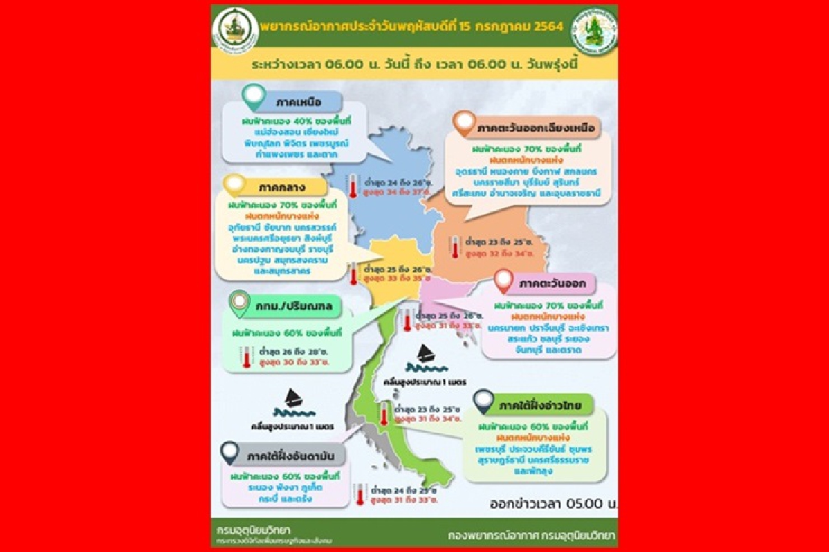 กรมอุตุนิยมวิทยา พยากรณ์อากาศประจำวันที่ 15 ก.ค. 2564 ลักษณะอากาศทั่วไป พยากรณ์อากาศ 24 ชั่วโมงข้างหน้า มรสุมตะวันตกเฉียงใต้กำลังปานกลางพัดปกคลุมทะเลอันดามัน ประเทศไทย และอ่าวไทย ประกอบกับมีหย่อมความกดอากาศต่ำปกคลุมบริเวณทะเลจีนใต้ตอนกลาง ลักษณะเช่นนี้ทำให้บริเวณภาคตะวันออกเฉียงเหนือตอนล่าง ภาคกลาง ภาคตะวันออก และภาคใต้มีฝนตกหนักบางแห่ง ขอให้ประชาชนบริเวณดังกล่าวระวังอันตรายจากฝนที่ตกหนักและฝนที่ตกสะสมไว้ด้วย