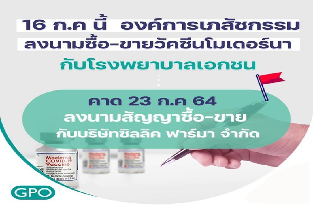 องค์การเภสัชกรรม เตรียมลงนามซื้อ-ขายวัคซีนโมเดอร์นากับโรงพยาบาลเอกชน 16 ก.ค. คาดเซ็นสัญญากับบริษัทตัวแทน 23 ก.ค.นี้