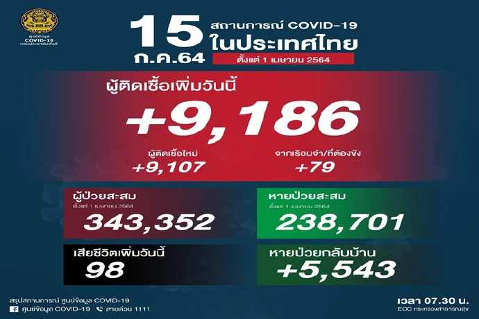 ศบค.เผยไทยติดเชื้อโควิดเพิ่ม 9,186 ราย มีผู้เสียชีวิตอีก 98 ราย ขณะที่ผู้ป่วยรักษาหายเพิ่ม 5,543 ราย