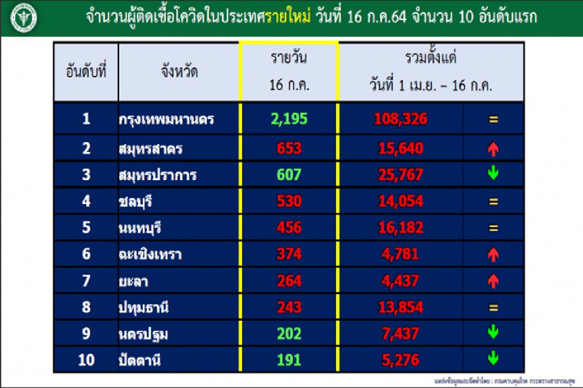 -จํานวนผู้ติดเชื้อโควิดในประเทศรายใหม่ วันนี้ 10 จังหวัดอันดับแรก 1.กรุงเทพมหานคร 2,195 ราย 2.สมุทรสาคร 653 ราย 3.สมุทรปราการ 607 ราย 4.ชลบุรี 530 ราย 5. นนทบุรี 456 ราย 6.ฉะเชิงเทรา 374 ราย 7.ยะลา 264 ราย 8.ปทุมธานี 243 ราย 9.นครปฐม 202 ราย และ 10.ปัตตานี 191 ราย