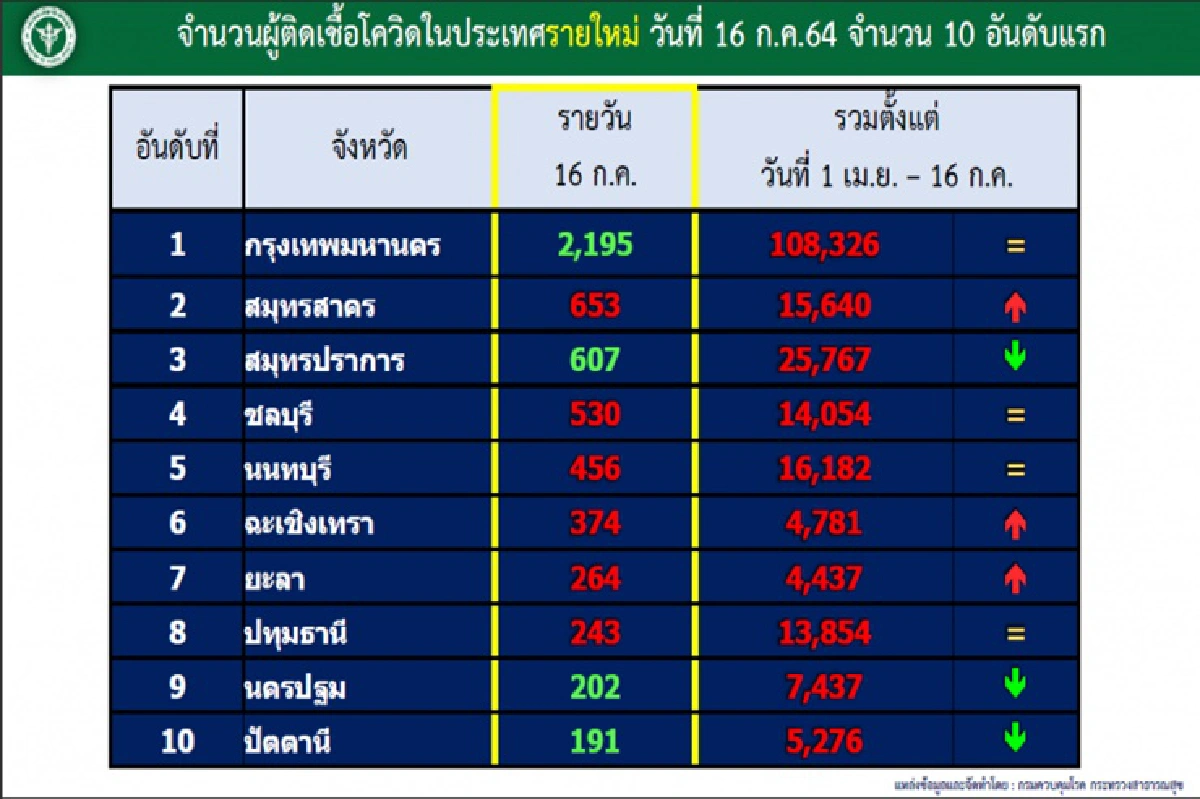 เช็ก! 10 จว.ติดโควิดสูงสุด กทม.นำโด่ง 2,195 ดับ 33 ราย