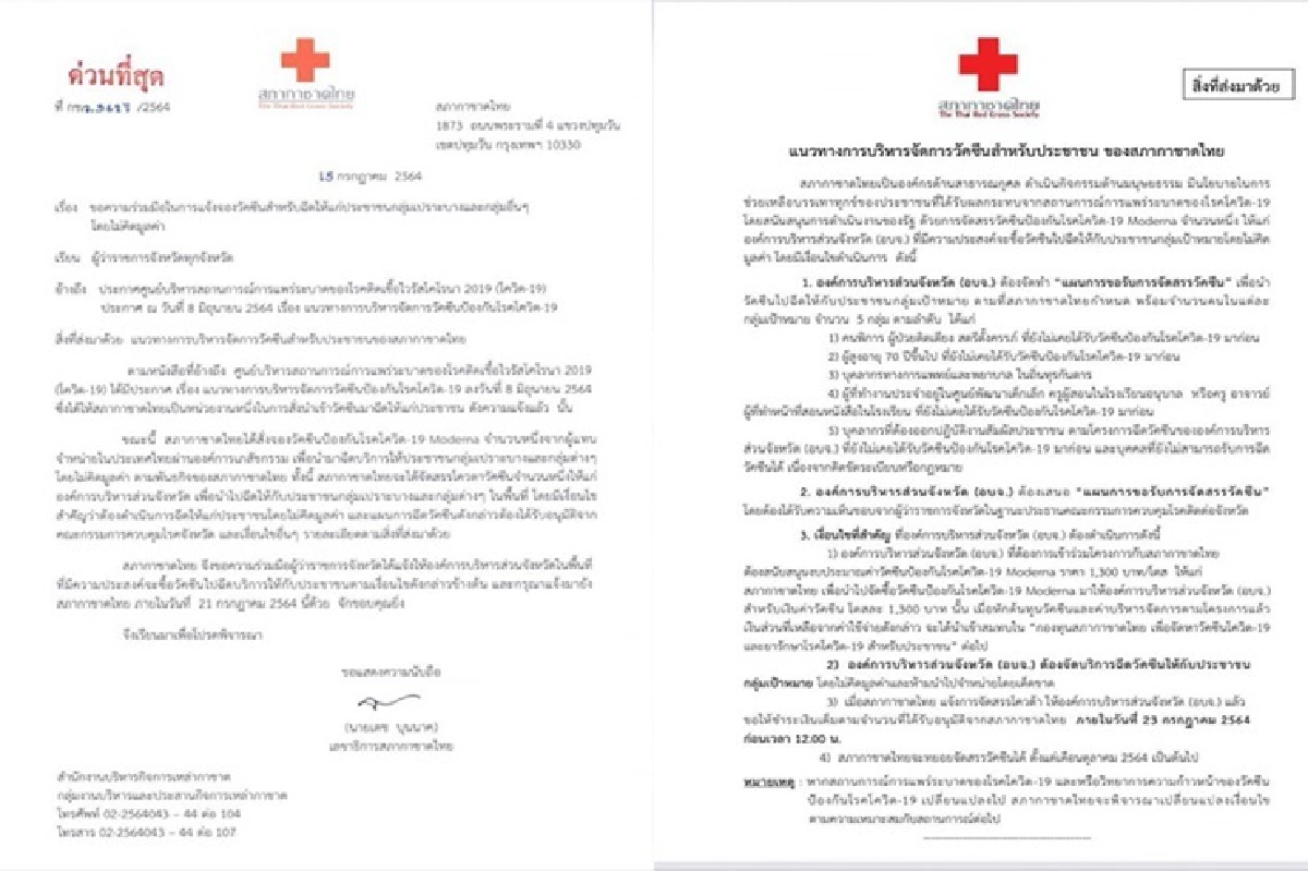 ขณะนี้ สภากาชาดไทยได้สั่งจองวัคซีนป้องกันโรคโควิด-19 Moderna จำนวนหนึ่งจากผู้แทนจำหน่ายในประเทศไทยผ่านองค์การเภสัชกรรม เพื่อนำมาฉีดบริการให้ประชาชนกลุ่มเปราะบางและกลุ่มต่างๆ โดยไม่คิดมูลค่า ตามพันธกิจของสภากาชาดไทย ทั้งนี้ สภากาชาดไทยจะได้จัดสรรโควตาวัคซีนจำนวนหนึ่งให้แก่ องค์การบริหารส่วนจังหวัด เพื่อนำไปฉีดให้กับประชาชนกลุ่มเปราะบางและกลุ่มต่างๆ ในพื้นที่ โดยมีเงื่อนไขสำคัญว่าต้องดำเนินการฉีดให้แก่ประชาชนโดยไม่คิดมูลค่า และแผนการฉีดวัคซีนดังกล่าวต้องได้รับอนุมัติจากคณะกรรมการควบคุมโรคจังหวัด และเงื่อนไขอื่นๆ รายละเอียดตามสิ่งที่ส่งมาด้วย