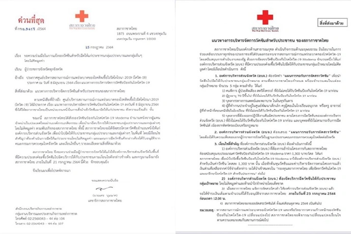 เมื่อวันที่ 16 ก.ค. 64 นายเตช บุนนาค เลขาธิการสภากาชาดไทย ลงนามในหนังสือด่วนที่สุด ถึงผู้ว่าราชจังหวัดทุกจังหวัด เรื่องขอความร่วมมือในการแจ้งจองวัคซีนสำหรับฉีดให้แก่ประชาชนกลุ่มเปราะบางและกลุ่มอื่นๆ โดยไม่คิดมูลค่า เนื้อหาระบุว่า ตามที่ศูนย์บริหารสถานการณ์การแพร่ระบาดของโรคติดเชื้อไวรัสโคโรนา 2019 (โควิด-19) ได้มีประกาศ เรื่อง แนวทางการบริหารจัดการวัคซีนป้องกันโรคโควิด-19 ลงวันที่ 8 มิถุนายน 2564 ซึ่งได้ให้สภากาชาดไทยเป็นหน่วยงานหนึ่งในการสั่งนำเข้าวัคซีนมาฉีดให้แก่ประชาชน ดังความแจ้งแล้ว นั้น