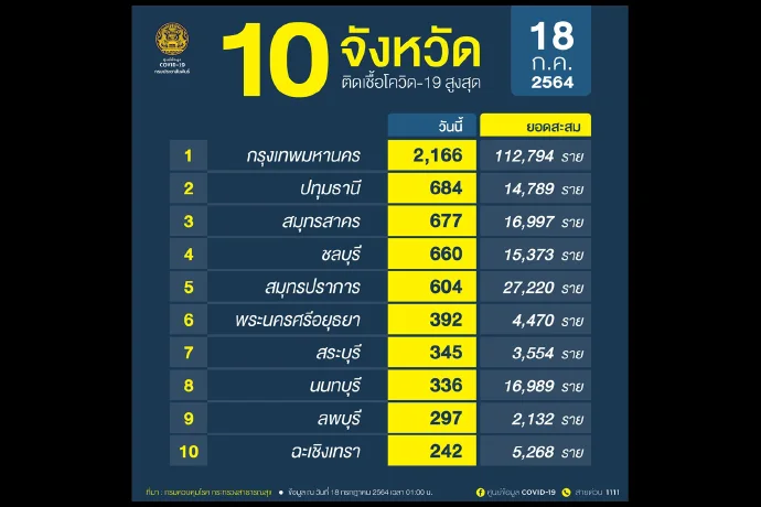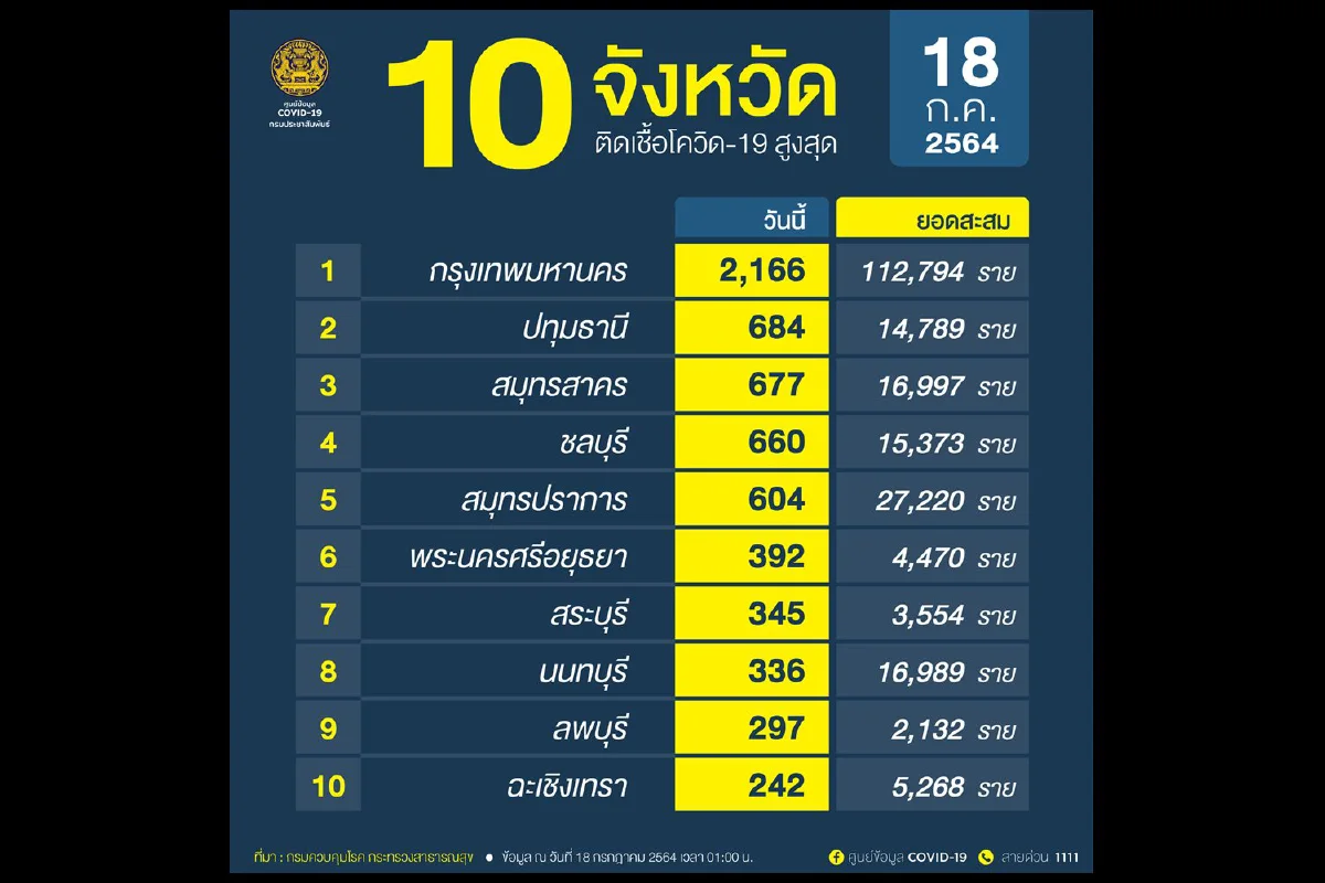 เมื่อวันที่ 18 ก.ค.64 ศูนย์บริหารสถานการณ์โควิด-19 (ศบค.) รายงานสถานการณ์การแพร่ระบาดของโรคติดเชื้อโควิดประจำวันดังนี้