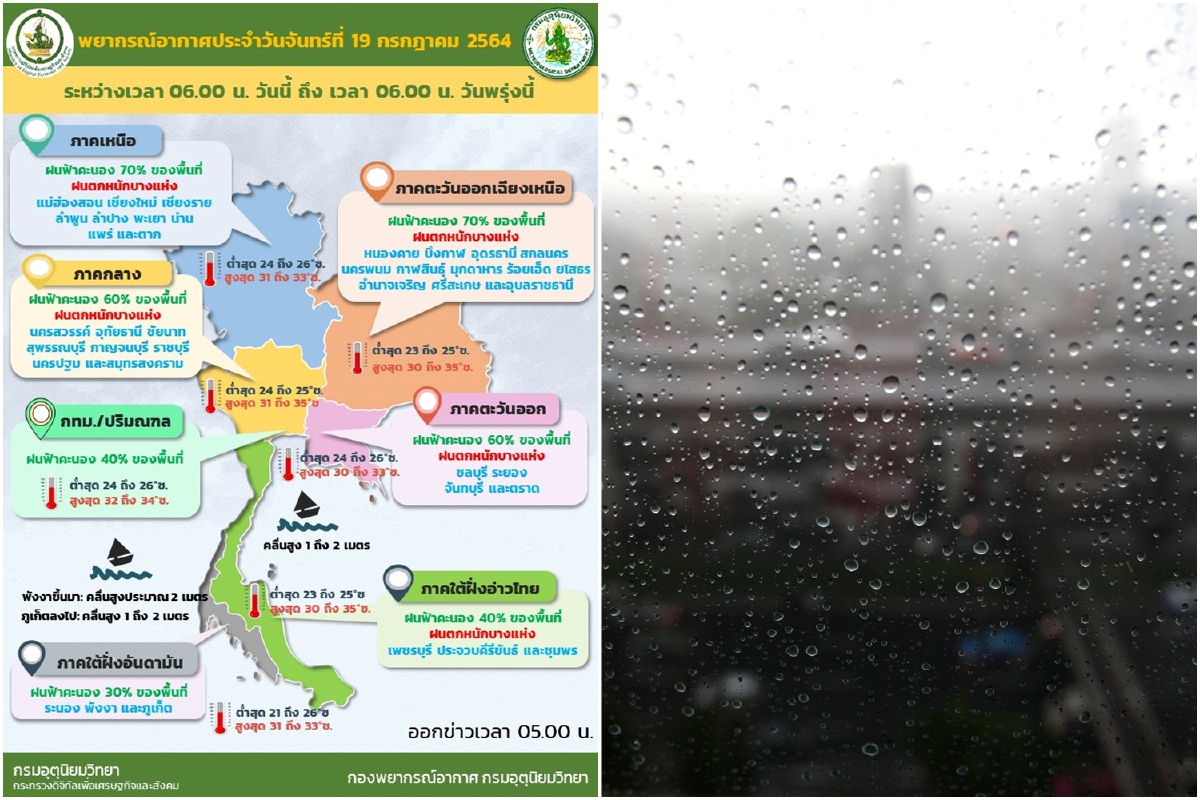 เมื่อวันที่ 19 ก.ค. 64 กรมอุตุนิยมวิทยารายงาน ลักษณะอากาศทั่วไปว่า พยากรณ์อากาศ 24 ชั่วโมงข้างหน้า บริเวณประเทศไทยตอนบนมีฝนเพิ่มขึ้นกับมีฝนตกหนักบางแห่งในภาคเหนือ ภาคตะวันออกเฉียงเหนือ ภาคกลาง ภาคตะวันออก และภาคใต้ฝั่งตะวันออก