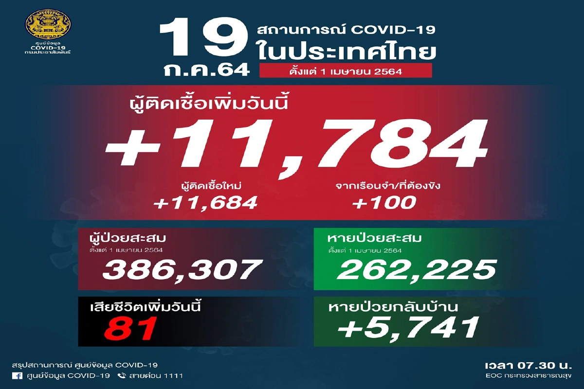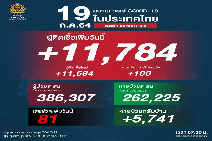 ยอดติดเชื้อยังเพิ่มต่อเนื่อง! ศบค.รายงานวันนี้ติดโควิดเพิ่มอีก 11,784 ราย เสียชีวิต 81ราย หายป่วยเพิ่มขึ้น 5,741 ราย
