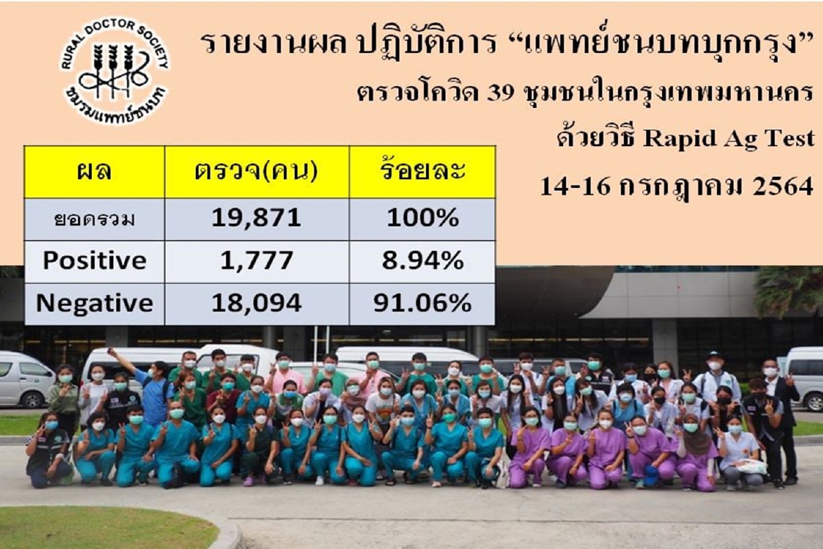 ชมรมแพทย์ชนบทได้รายงาน สรุปผลปฏิบัติการ “แพทย์ชนบทบุกกรุง” โควิดลามลึก ผู้คนทุกข์หนัก โดยระบุว่า ปฏิบัติการ “แพทย์ชนบทบุกกรุง” ในครั้งนี้ ใช้เวลา 3 วัน 14-16 กรกฎาคม 2564 ในการตรวจหาเชื้อโควิดด้วยวิธี Rapid Ag Test ให้กับ 39 ชุมชนแออัดในกรุงเทพมหานคร โดยมีทีมแพทย์ชนบท 6 ทีมกว่า 60 ชีวิตมาร่วมปฏิบัติการ