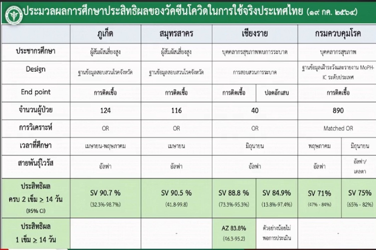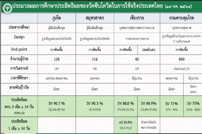 สธ.เปิดผลการศึกษาประสิทธิผลจากการฉีดวัคซีนซิโนแวค-แอสตร้าฯในไทย พบมีประสิทธิผลในการป้องกันติดเชื้อ และปอดอักเสบจากสายพันธุ์อัลฟา ขณะที่ช่วงสายพันธุ์เดลตาระบาด ยังไม่พบว่าประสิทธิผลการป้องกันติดเชื้อลดลง