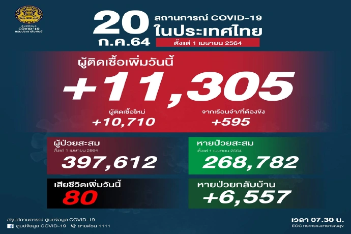 ไทยติดโควิดเพิ่ม 11,305รายเสียชีวิตอีก80