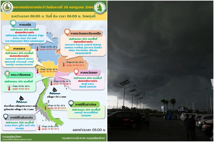 เมื่อวันที่ 20 ก.ค. 64 กรมอุตุนิยมวิทยารายงาน ลักษณะอากาศทั่วไปว่า พยากรณ์อากาศ 24 ชั่วโมงข้างหน้า ร่องมรสุมพาดผ่านประเทศเมียนมา ลาวตอนบน และเวียดนามตอนบน ประกอบกับมรสุมตะวันตกเฉียงใต้ที่พัดปกคลุมทะเลอันดามัน ประเทศไทย และอ่าวไทยมีกำลังแรงขึ้น