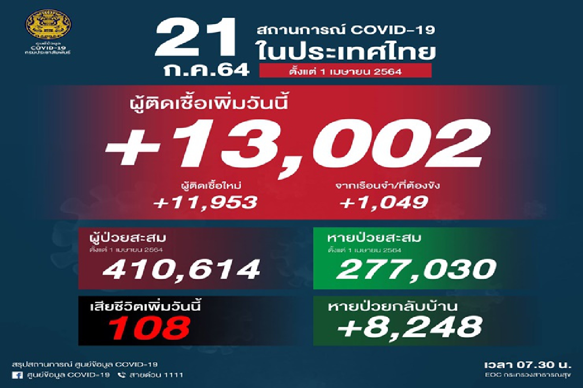 ศบค.เผยไทยติดเชื้อโควิดเพิ่ม13,002 ราย มีผู้เสียชีวิตอีก 108 ราย ขณะที่ผู้ป่วยรักษาหายเพิ่ม 8,248 ราย