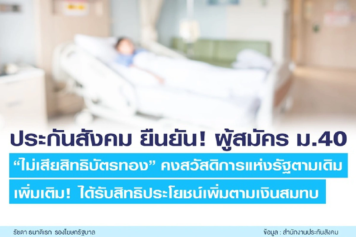 รองโฆษกรัฐบาล ยืนยันกลุ่มอาชีพอิสระที่สมัครประกันสังคมมาตรา 40 จะไม่เสียสิทธิบัตรทอง และบัตรสวัสดิการแห่งรัฐ ได้รับสิทธิประโยชน์เพิ่มเติมตามเงินสมทบ