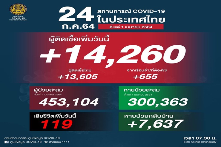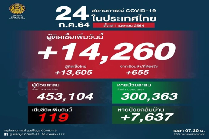 ศบค.เผยไทยติดเชื้อโควิดเพิ่ม 14,260 ราย มีผู้เสียชีวิตอีก 119 ราย ขณะที่ผู้ป่วยรักษาหายเพิ่ม 7,637 ราย