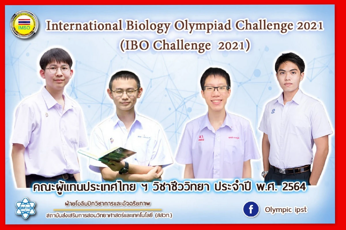 ศาสตราจารย์ ดร.ชูกิจ ลิมปิจำนงค์ ผู้อำนวยการสถาบันส่งเสริมการสอนวิทยาศาสตร์และเทคโนโลยี (สสวท.) เปิดเผยว่าปีนี้ ผู้แทนประเทศไทยชีววิทยาโอลิมปิกระหว่างประเทศ ประจำปี 2564 จำนวน 4 คน เข้าร่วมการแข่งขัน International Biology Olympiad Challenge 2021 (IBO Challenge 2021) ซึ่งเป็นการแข่งขันผ่านระบบออนไลน์จากประเทศไทย โดยประเทศเจ้าภาพคือสาธารณรัฐโปรตุเกส ระหว่างวันที่ 18 – 23 กรกฎาคม 2564 ผลปรากฎว่า ผู้แทนประเทศไทย IBO ได้รับ 1 เหรียญทอง 3 เหรียญเงิน ดังนี้