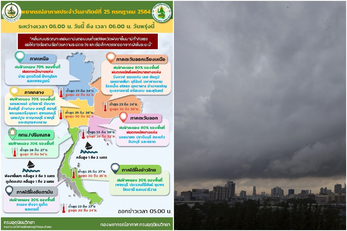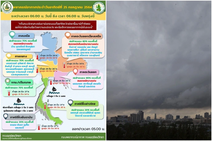 เมื่อวันที่ 25 ก.ค. 64 กรมอุตุนิยมวิทยารายงาน ลักษณะอากาศทั่วไปว่า พยากรณ์อากาศ 24 ชั่วโมงข้างหน้า มรสุมตะวันตกเฉียงใต้พัดปกคลุมทะเลอันดามัน ประเทศไทย และอ่าวไทย ประกอบกับหย่อมความกดอากาศต่ำกำลังแรงปกคลุมชายฝั่งประเทศเวียดนามตอนบนและอ่าวตังเกี๋ย ลักษณะเช่นนี้ทำให้ภาคเหนือ และภาคตะวันออก มีฝนตกหนักบางแห่ง โดยภาคตะวันออกเฉียงเหนือ มีฝนตกหนักมากบางพื้นที่