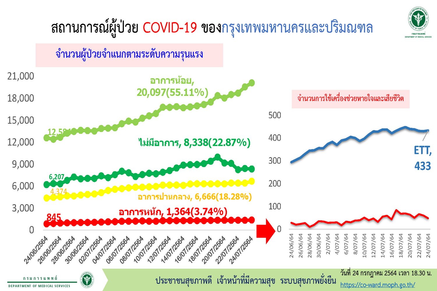 เมื่อวันที่ 26 ก.ค. 64 ศูนย์บริหารสถานการณ์โควิด19 (ศบค.)รายงานสถานการณ์ผู้ป่วยโควิด19ของกรุงเทพฯและปริมณฑลตั้งแต่ช่วงวันที่ 24 มิ.ย.64 ถึง 24 ก.ค.64 โดยจำแนกจำนวนผู้ป่วยตามระดับความรุนแรงพบว่า