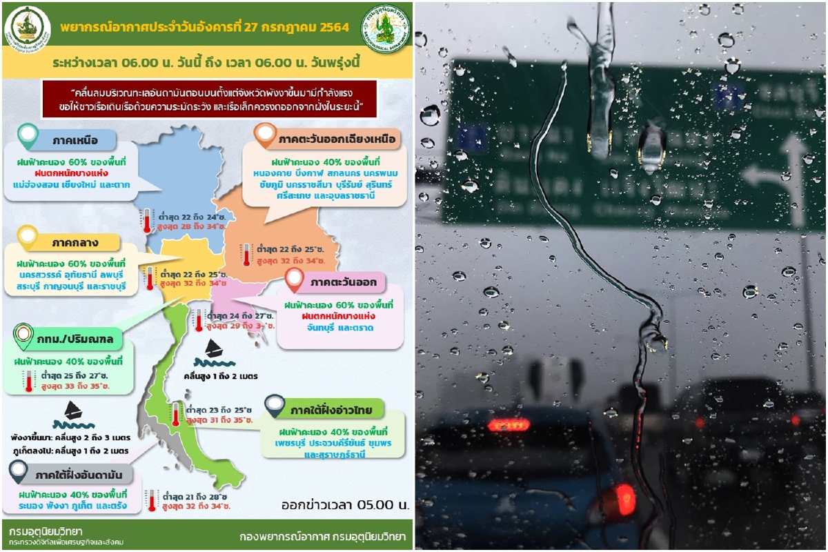 เมื่อวันที่ 27 ก.ค. 64 กรมอุตุนิยมวิทยารายงาน ลักษณะอากาศทั่วไปดังนี้ พยากรณ์อากาศ 24 ชั่วโมงข้างหน้า ร่องมรสุมพาดผ่านประเทศเมียนมา ตอนบนของภาคเหนือ ประเทศลาว และเวียดนามตอนบน ประกอบกับมรสุมตะวันตกเฉียงใต้กำลังแรง พัดปกคลุมทะเลอันดามัน ประเทศไทย และอ่าวไทย