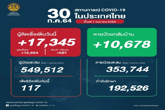 ศบค.เผยไทยติดเชื้อโควิดเพิ่ม 17,345 ราย มีผู้เสียชีวิตอีก 117 ราย ขณะที่ผู้ป่วยรักษาหายเพิ่ม 10,678 ราย