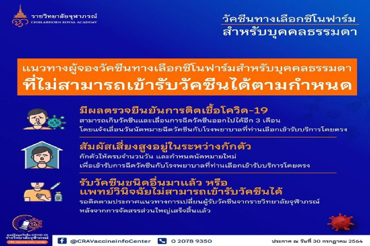 เลขาธิการราชวิทยาลัยจุฬาภรณ์ แจง 3 แนวทางผู้จอง"ซิโนฟาร์ม" ไม่สามารถเข้ารับวัคซีนได้ตามกำหนด