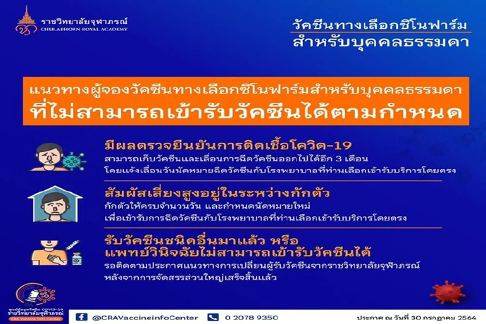 - รอติดตามประกาศแนวทางการเปลี่ยนผู้รับวัคซีนจากราชวิทยาลัยจุฬาภรณ์หลังจากการจัดสรรส่วนใหญ่เสร็จสิ้นแล้ว