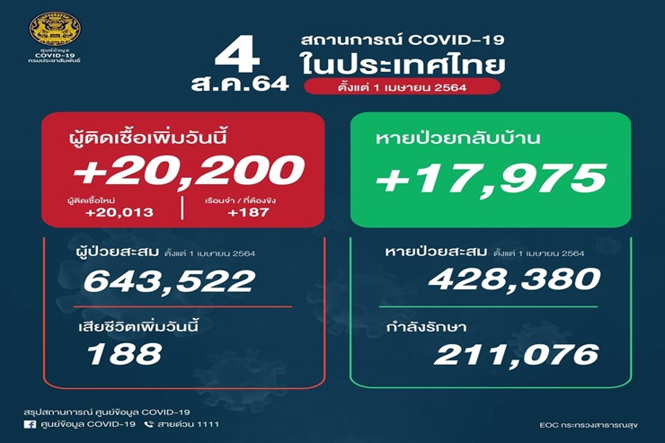 -ผู้ติดเชื้อเพิ่มขึ้นรวม 20,200 ราย จำแนกเป็น ติดเชื้อใหม่ 20,013 ราย ติดเชื้อภายในเรือนจำ/ที่ต้องขัง187 ราย