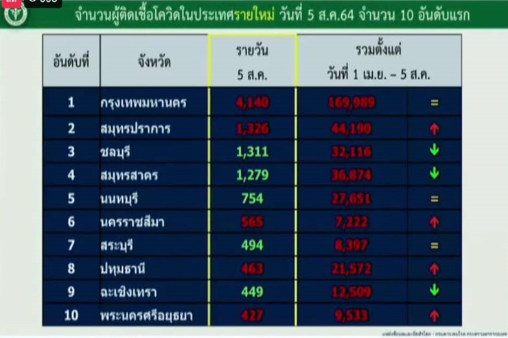 เมื่อวันที่ 5 ส.ค. 64 ศูนย์บริหารสถานการณ์การแพร่ระบาดของโรคติดเชื้อไวรัสโคโรนา 2019 (โควิด-19) หรือ ศบค. รายงาน สถานการณ์แพร่ระบาดของโรคติดเชื้อโควิด-19 ประจำวัน โดยมีรายละเอียดดังนี้