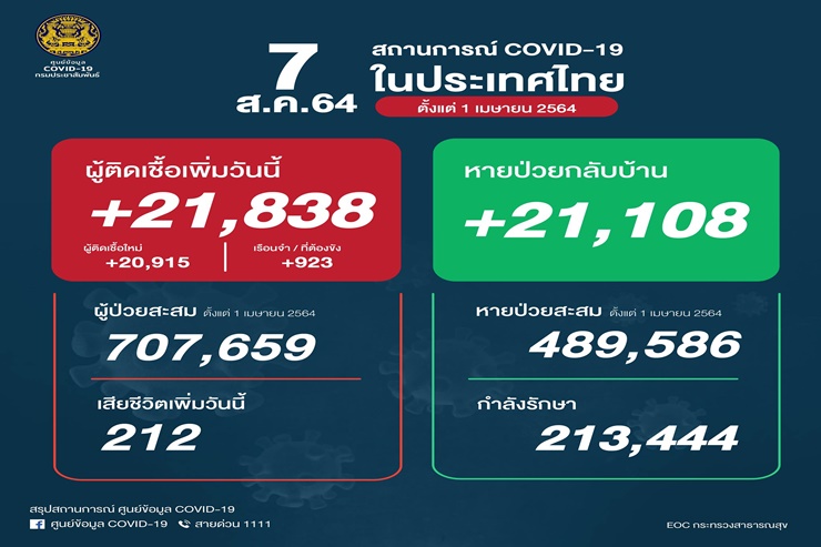 ศบค. เผย ยอดติดเชื้อโควิด-19 วันนี้ เพิ่มขึ้น 21,838 ราย เสียชีวิตอีก 212ราย หายป่วยกลับบ้าน 21,108 ราย
