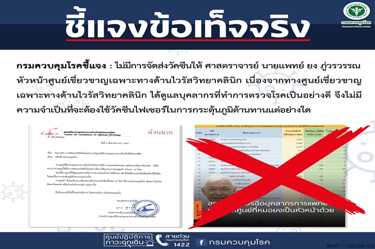 กรมควบคุมโรค โพสต์ข้อความชี้แจงกรณีที่โลกออนไลน์ได้มีการเผยแพร่เอกสารการจัดสรรวัคซีนไฟเซอร์ ที่ได้รับบริจาคจากสหรัฐอเมริกา จำนวน 20 โดส ให้กับศูนย์เชี่ยวชาญเฉพาะทางด้านไวรัสวิทยาคลินิก โรงพยาบาลจุฬาลงกรณ์ ว่า ไม่มีการจัดส่งวัคซีนให้ ศ.นพ.ยง ภู่วรวรรณ เนื่องจากศูนย์เชี่ยวชาญเฉพาะทางด้านไวรัสวิทยาคลินิกได้ดูแลบุคลากรที่ทำการตรวจโรคเป็นอย่างดี จึงไม่จำเป็นที่จะต้องใช้วัคซีนไฟเซอร์ในการกระตุ้นภูมิต้านทานแต่อย่างใด