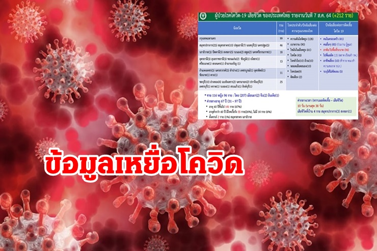 -ผู้เสียชีวิตทั้ง 212 ราย เป็นชาย 116 ราย หญิง 96 ราย อายุระหว่าง 31-97 ปี เป็นชาวไทย 207 เมียนมา2ราย จีน 2 ราย อินเดีย 1 ราย โดย อายุ 60 ปี ขึ้นไป 141 ราย อายุต่ำกว่า 60 ปี มีโรคเรื้อรัง 55 ราย ไม่มีโรคเรื้อรัง 14 ราย ตั้งครรภ์ 2 ราย (สมุทรสาคร,นราธิวาส) เสียชีวิตที่บ้าน 4 ราย (สมุทรปราการ 3 ราย สงขลา 1 ราย ) โดยกรุงเทพมหานคร เสียชีวิตสูงสุด 99 ราย