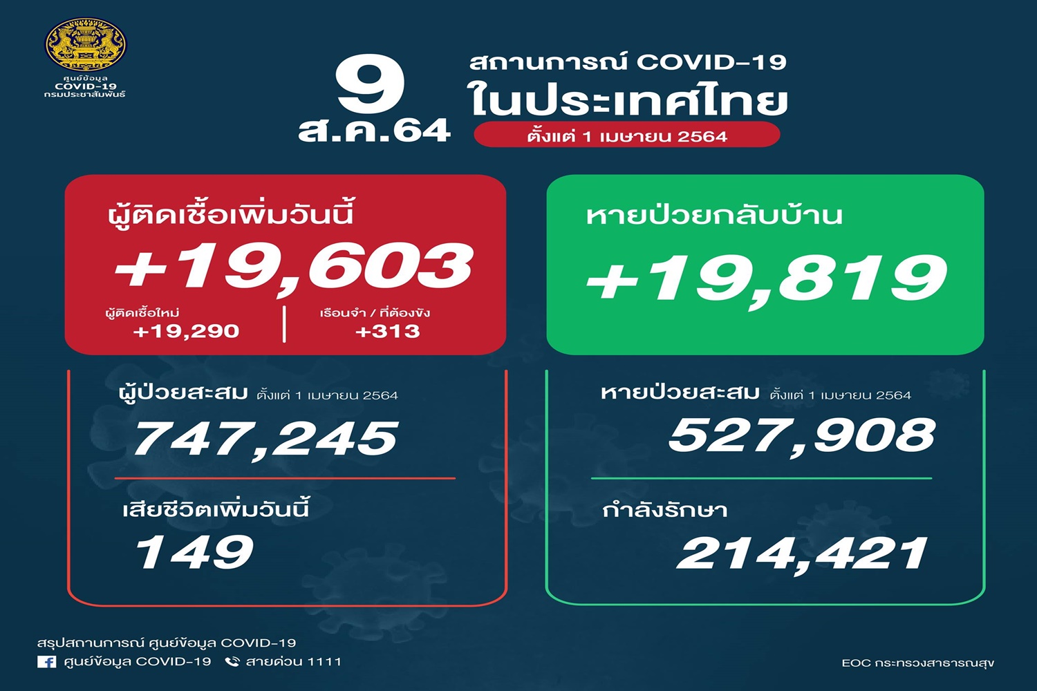 ศบค.รายงานยอดโควิดวันนี้ พบผู้ติดเชื้อเพิ่มขึ้น 19,603 ราย เสียชีวิต 149 ราย ผู้ป่วยรักษาหายเพิ่ม 19,819 ราย เหลือรักษาอยู่ 214,421 ราย