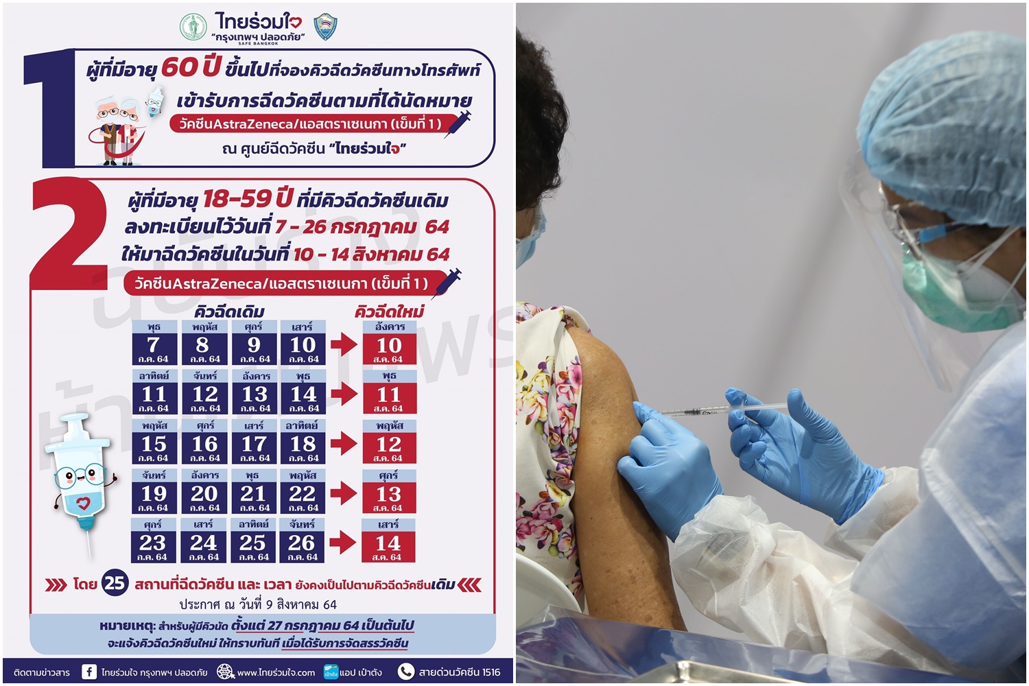 สำหรับผู้ที่มีอายุ 18 -59 ปี ที่ลงทะเบียนฉีดวัคซีนไทยร่วมใจ กรุงเทพฯ ปลอดภัย โดยลงทะเบียนฉีดวัคซีนรอบวันที่ 7-26 ก.ค 64 ให้มาฉีดวัคซีนในวันที่ 10-14 ส.ค.64 (รับการฉีดวัคซีนแอสตราเซเนกา AstraZeneca เข็มที่ 1) โดยมีรายละเอียดดังนี้