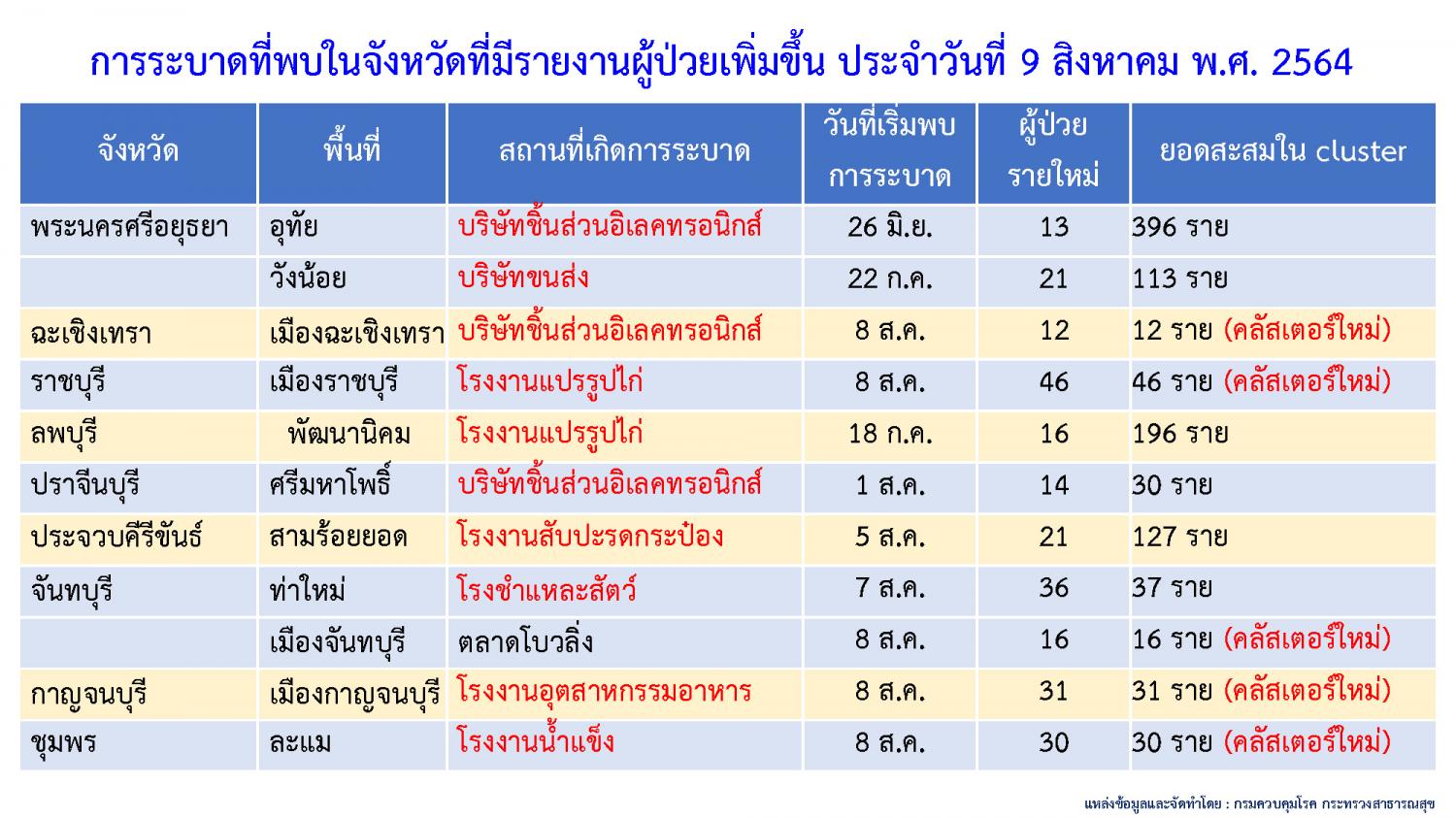 1. จ.ปทุมธานี อ.เมืองปทุมธานี โรงงานผลิตภัณฑ์ไก่ พบติดเชื้อ 9 ราย