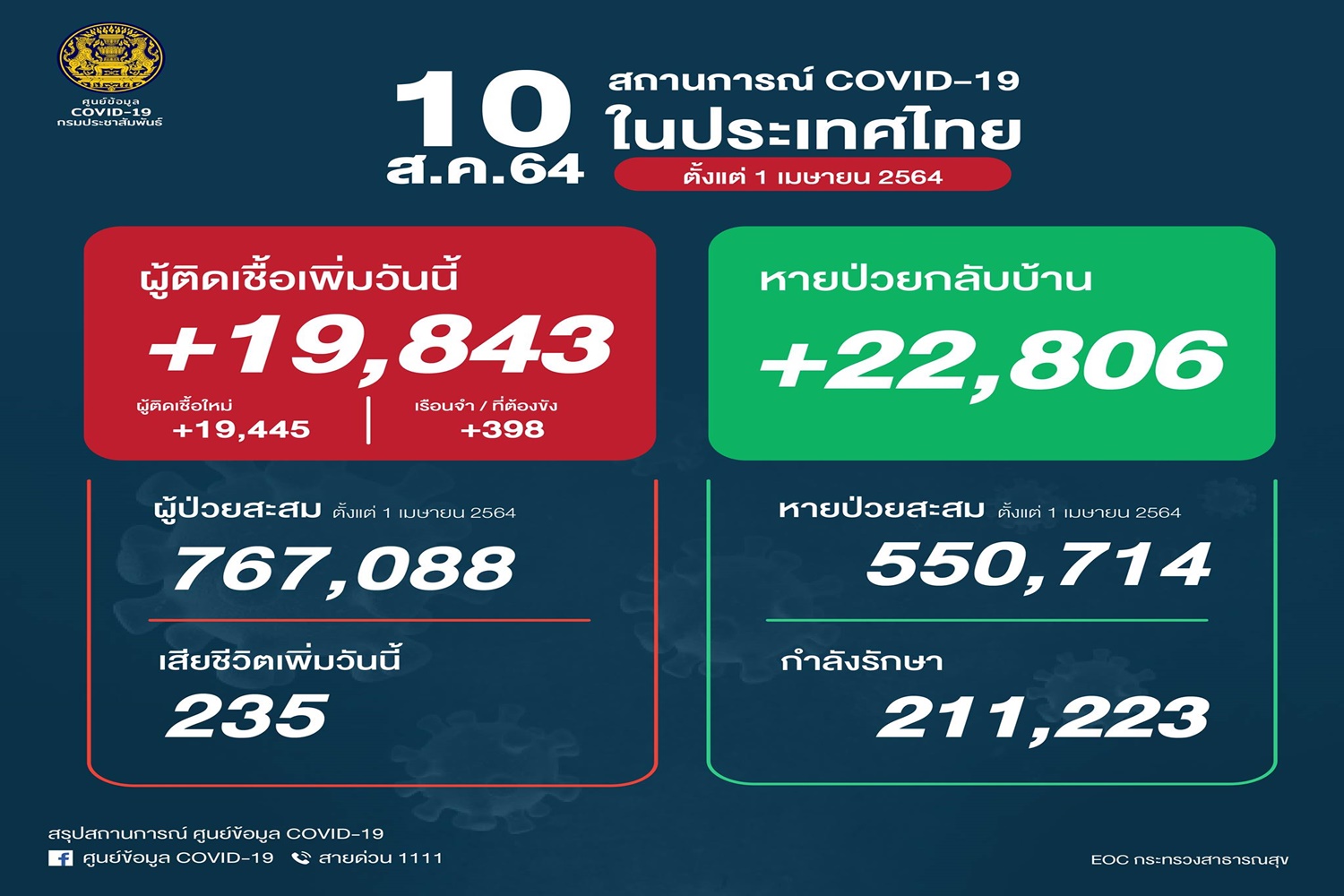-ผู้ติดเชื้อเพิ่มขึ้นรวม 19,843 ราย จำแนกเป็น ติดเชื้อใหม่ 19,445 ราย ติดเชื้อภายในเรือนจำ/ที่ต้องขัง 398 ราย