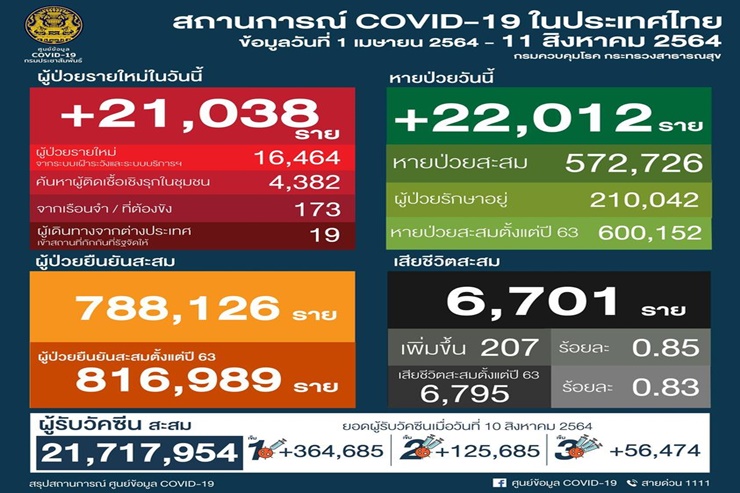 เมื่อวันที่ 11 ส.ค. 64 ศูนย์บริหารสถานการณ์การแพร่ระบาดของโรคติดเชื้อไวรัสโคโรนา 2019 (โควิด-19) หรือ ศบค. รายงาน สถานการณ์แพร่ระบาดของโรคติดเชื้อโควิด-19 ประจำวัน โดยมีรายละเอียดดังนี้