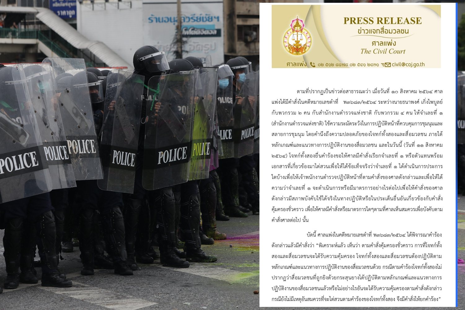 ที่ศาลแพ่ง ถ.รัชดาภิเษก วันที่ 11 ส.ค.64 ผู้สื่อข่าวรายงานว่า วันนี้ ทนายความของผู้สื่อข่าวและช่างภาพ สำนักข่าว Plus Seven และ The Matter สำนักออนไลน์บนเว็บไซต์ ที่เป็นโจทก์ยื่นฟ้องสำนักงานตำรวจแห่งชาติ (ตร.) จำเลยที่ 1 ในคดีหมายเลขดำ พ.3683/2564 ได้ยื่นคำร้องขอให้ศาลมีค่าสั่งเรียกจําเลยที่ 1 หรือตัวแทนพร้อมเอกสารที่เกี่ยวข้องมาไต่สวนเพื่อให้ได้ข้อเท็จจริงว่าจําเลยที่ 1 ได้ดำเนินการประการใดบ้างที่ให้ตำรวจปฏิบัติหน้าที่ตามคำสั่งของศาลแพ่ง (เมื่อวันที่ 10 ส.ค.64) ให้จำเลยที่ 1 ใช้ความระมัดระวังในการปฏิบัติหน้าที่ควบคุมการชุมนุมและสลายการชุมนุมโดยค่านึงถึงความปลอดภัยของโจทก์ทั้งสองและสื่อมวลชนภายใต้หลักเกณฑ์และแนวทางการปฏิบัติงานของสื่อมวลชน