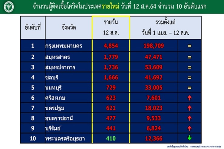 -จํานวนผู้ติดเชื้อโควิดในประเทศรายใหม่ วันนี้ 10 จังหวัดอันดับแรก 1.กรุงเทพมหานคร 4,854 ราย 2.สมุทรสาคร 1,779 ราย 3.สมุทรปราการ 1,736 ราย 4.ชลบุรี 1,666 ราย 5. นนทบุรี 729 ราย 6.ศรีสะเกษ 623 ราย 7.นครปฐม 621ราย 8.อุบลราชธานี477 ราย 9.บุรีรัมย์ 441 ราย และ 10.พระนครศรีอยุธยา 410 ราย