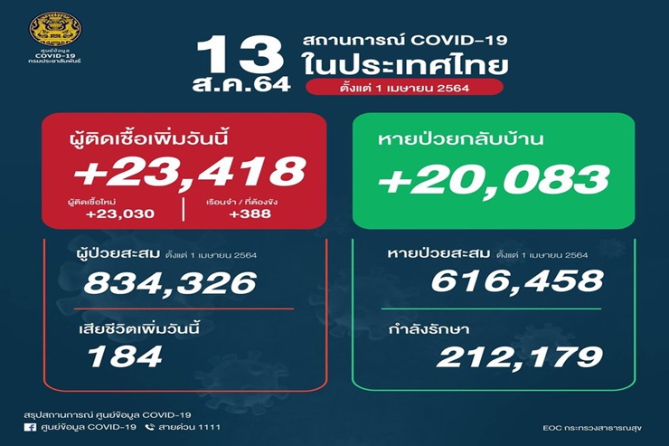 -ผู้ติดเชื้อเพิ่มขึ้นรวม 23,418ราย จำแนกเป็น ติดเชื้อใหม่ 23,030 ราย ติดเชื้อภายในเรือนจำ/ที่ต้องขัง388 ราย