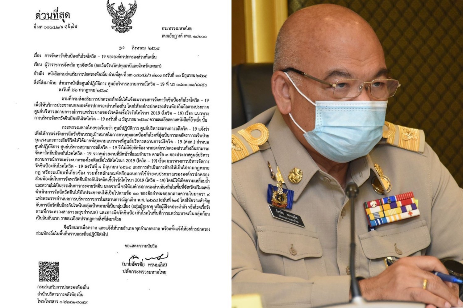 มท.แจงไฟเขียวท้องถิ่นซื้อวัคซีนเว้นปทุมธานี-สงขลา เพราะมีหนังสือขอหารือจึงตอบเป็นการเฉพาะและถือโอกาสแจ้งแนวปฎิบัติสำหรับจังหวัดอื่นด้วย