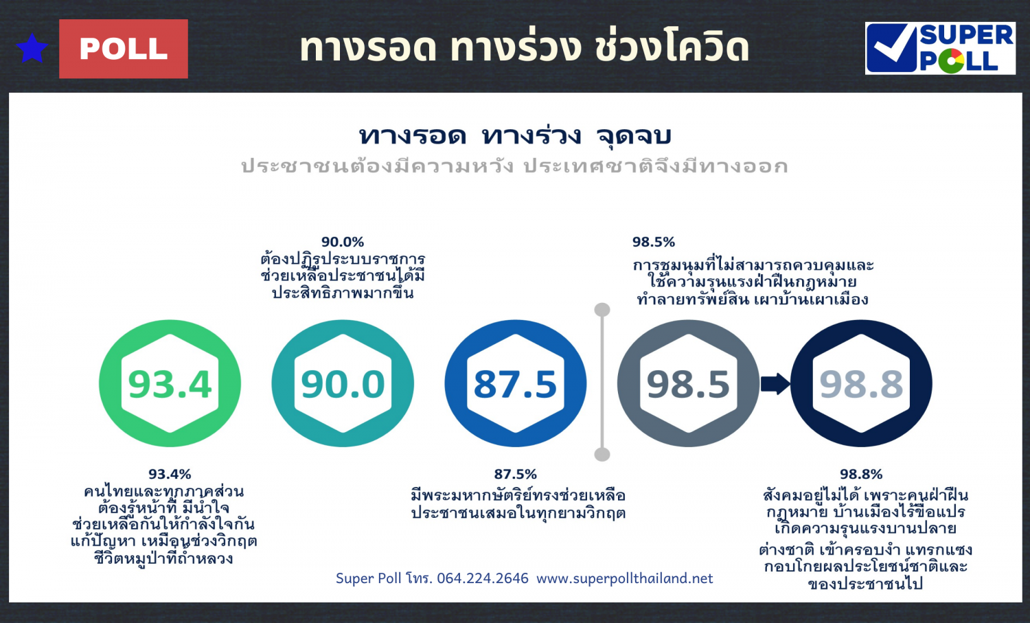 ผอ.ซูเปอร์โพล กล่าวว่า ข้อมูลที่ค้นพบครั้งนี้ชี้ให้เห็นว่า ประชาชนส่วนใหญ่เห็น “ทางรอด” ที่จะผ่านไปด้วยกันในวิกฤตโควิด จากพลังความรักความสามัคคีเป็นหนึ่งเดียว ที่มีแบบอย่างที่ดีมาจาก “หมูป่าถ้ำหลวง” ที่มีความร่วมมือกันทุกภาคส่วน ทั้งสถาบันหลัก ภาครัฐ ภาคเอกชน ภาคเอกชนและต่างประเทศ มุ่งเป้าหมายเดียวกันคือ “ช่วยชีวิตเด็กทั้งหมด” ซึ่งแสดงถึงจุดแข็งของวัฒนธรรมไทยต่อชาวโลกที่มีน้ำใจช่วยเหลือเอื้อเฟื้อกัน และยังสะท้อนให้เห็นถึงทางรอด ผ่านการเรียนรู้ติดตามสถานการณ์โลก ปรับตัวครั้งใหญ่ในการใช้ชีวิต ช่วยเหลือกันและกันบนโลกแห่งความเป็นจริงที่เปลี่ยนไปอย่างสิ้นเชิง โดยพุ่งเป้าหมายเดียวกัน คือ “พาชาติรอดและช่วยชีวิตเราคนไทยทุกคน” จึงจำเป็นต้องทำให้ประชาชนมีความหวัง ประเทศชาติจึงมีทางออกที่ดี