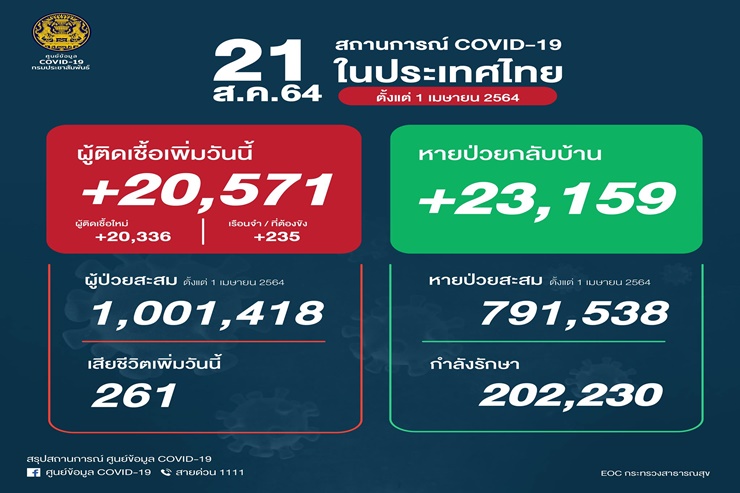 ศบค. เผย ยอดติดเชื้อโควิด-19 วันนี้ เพิ่มขึ้น 20,571 ราย เสียชีวิตอีก 261 ราย หายป่วยกลับบ้าน 23,159 ราย เหลือกำลังรักษา 202,230 ราย