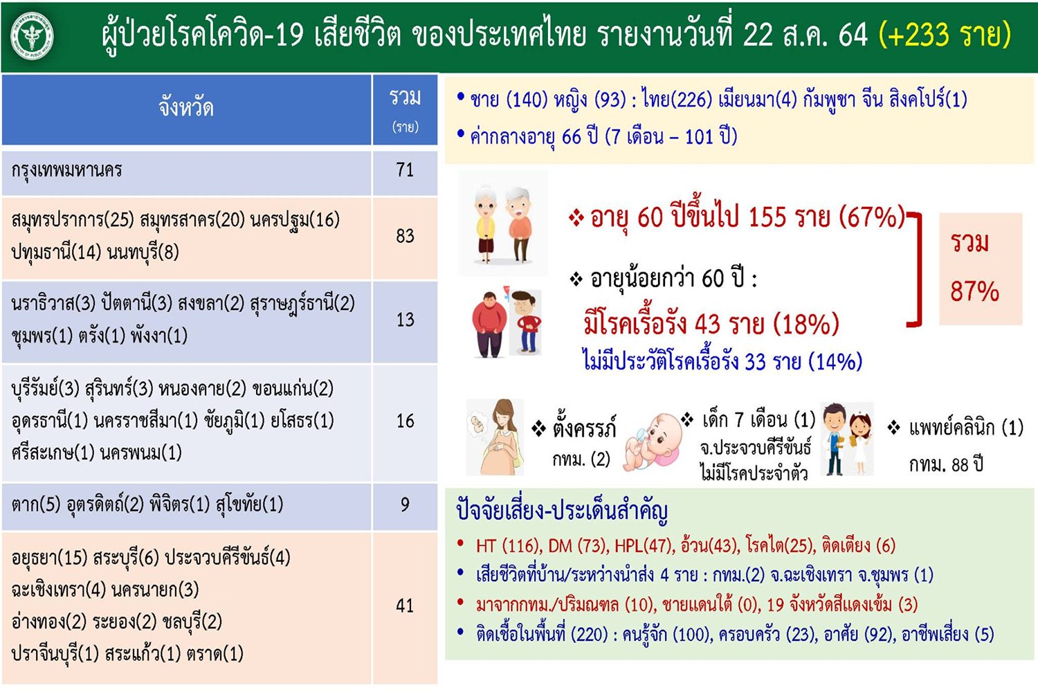 - เสียชีวิต 233 ราย เป็นชาย 140 ราย หญิง 93 ราย อายุระหว่าง 7 เดือน - 101 ปี (อายุเฉลี่ย 66 ปี) โดยผู้เสียชีวิตส่วนใหญ่เป็นผู้สูงอายุเกินกว่า 60 ปี และมีโรคประจำตัวเรื้อรัง